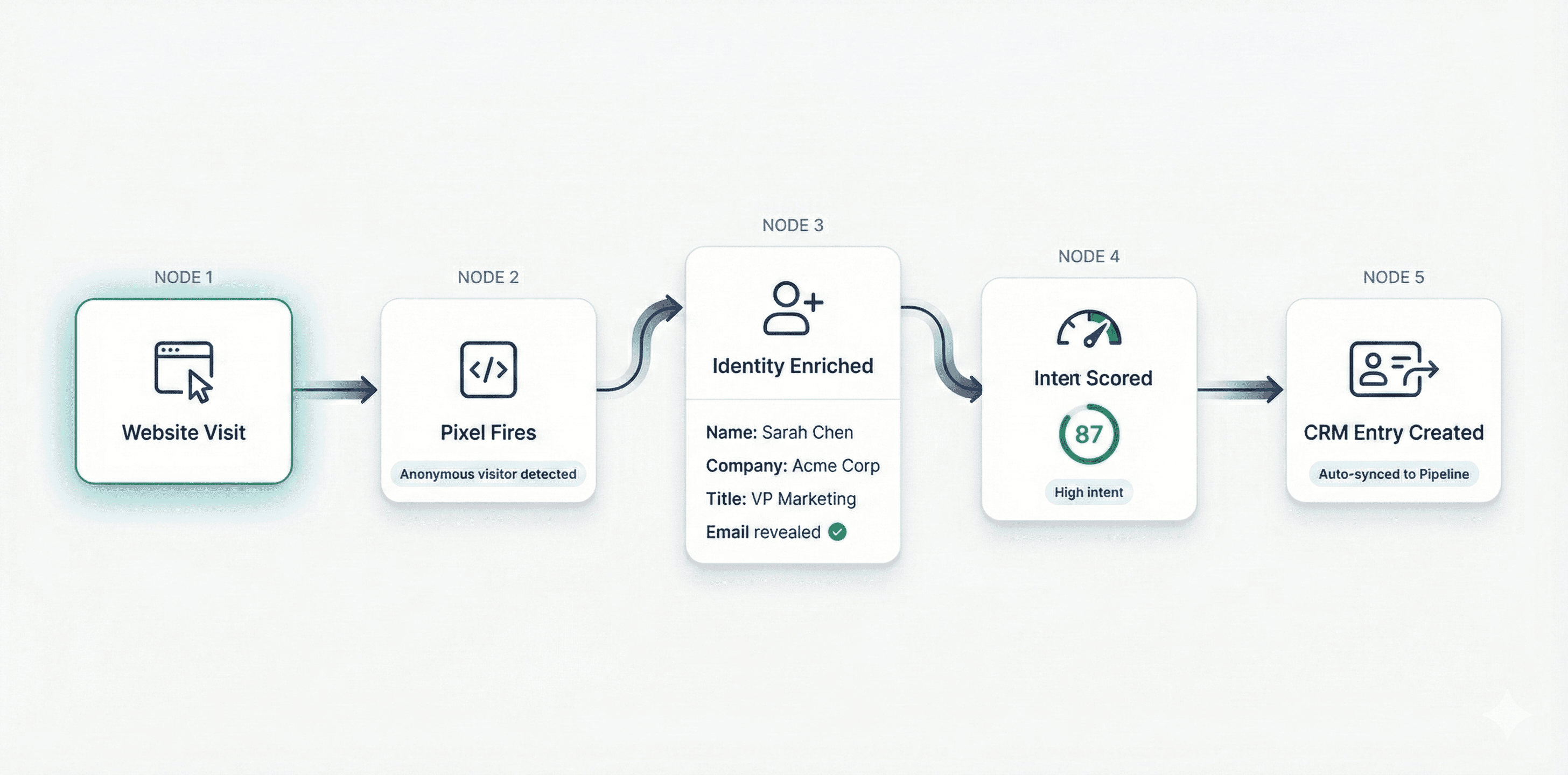 Custom pixel sits above your site, identifies anonymous visitors, enriches with contact data, and triggers intent scoring. Feeds directly into your CRM—no manual data entry. The intelligence layer learns from every session.