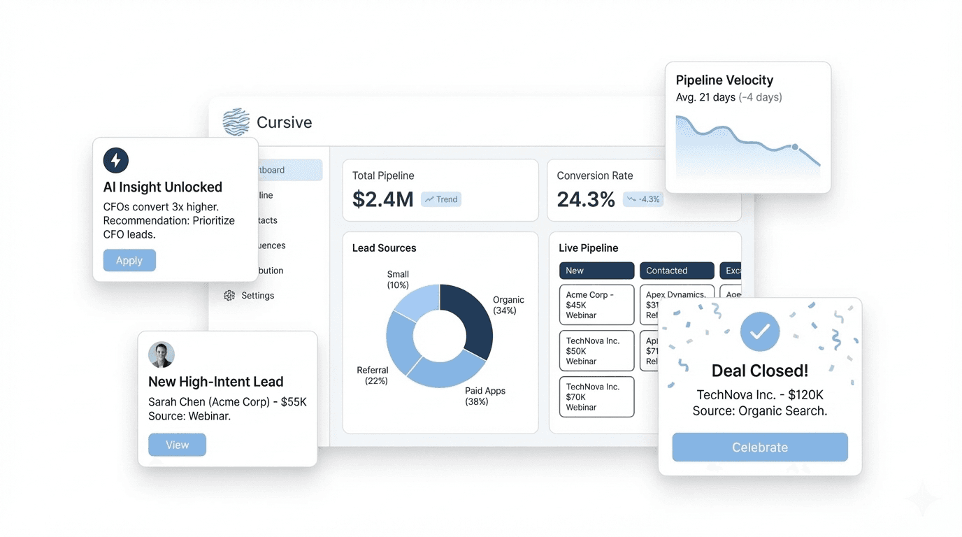 Cursive unifies attribution and buyer intent for all your leads with proven systems that continuously improve, adapt, and run your business to give you back your most important asset: your time.